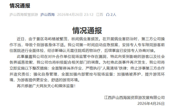 欧博百家乐官网4月26日晚,江西庐山西海国资旅游发展有限公司发布情况通报称,近日,由于景区岛屿植被茂密,林间病虫害频发。在开展病虫害防治时,第三方公司操作不当,导致个别旅客躯壳不适。我公司第一时辰运行济急预案,安排专东说念主专车追随旅客前去病院进行全面体检,经会诊阐发无需入院或药物调整,后续事宜已安排专东说念主协商对接。