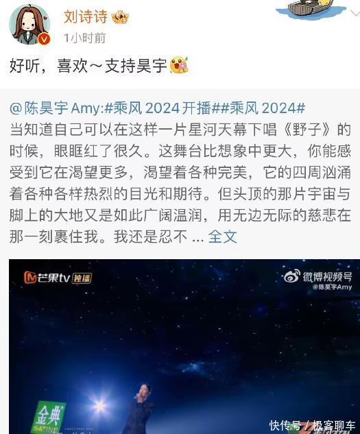 刘诗诗也在微博发文替她打call,给她加了一把“火”,让更多的不雅众刚毅到陈昊宇。